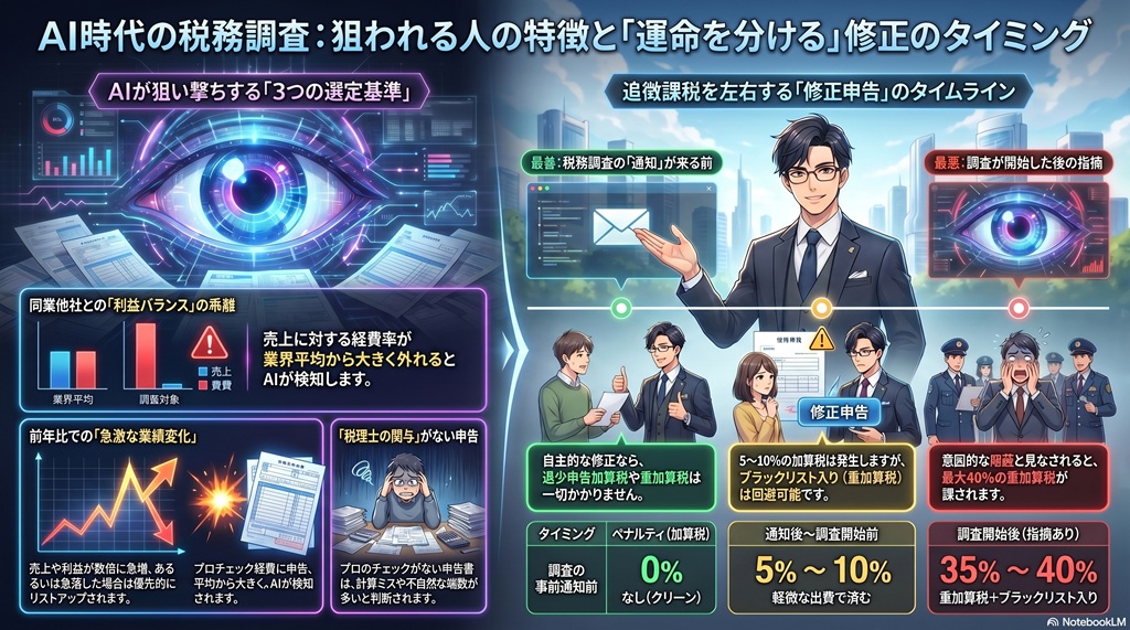 - AI時代の税務調査:選ばれやすい人の特徴と重加算税40%を避ける修正申告の最適タイミング