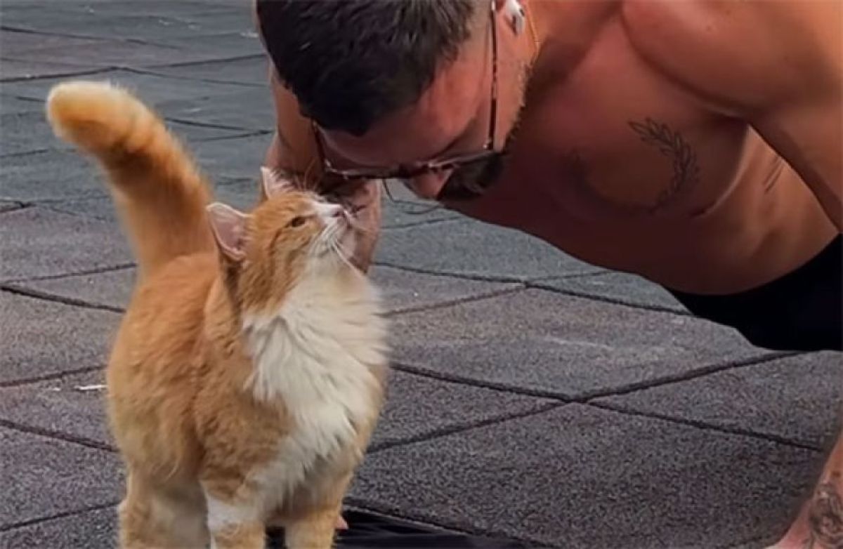 - 筋トレ中のヒゲメンを猫がロックオン!素敵な家族のできあがり